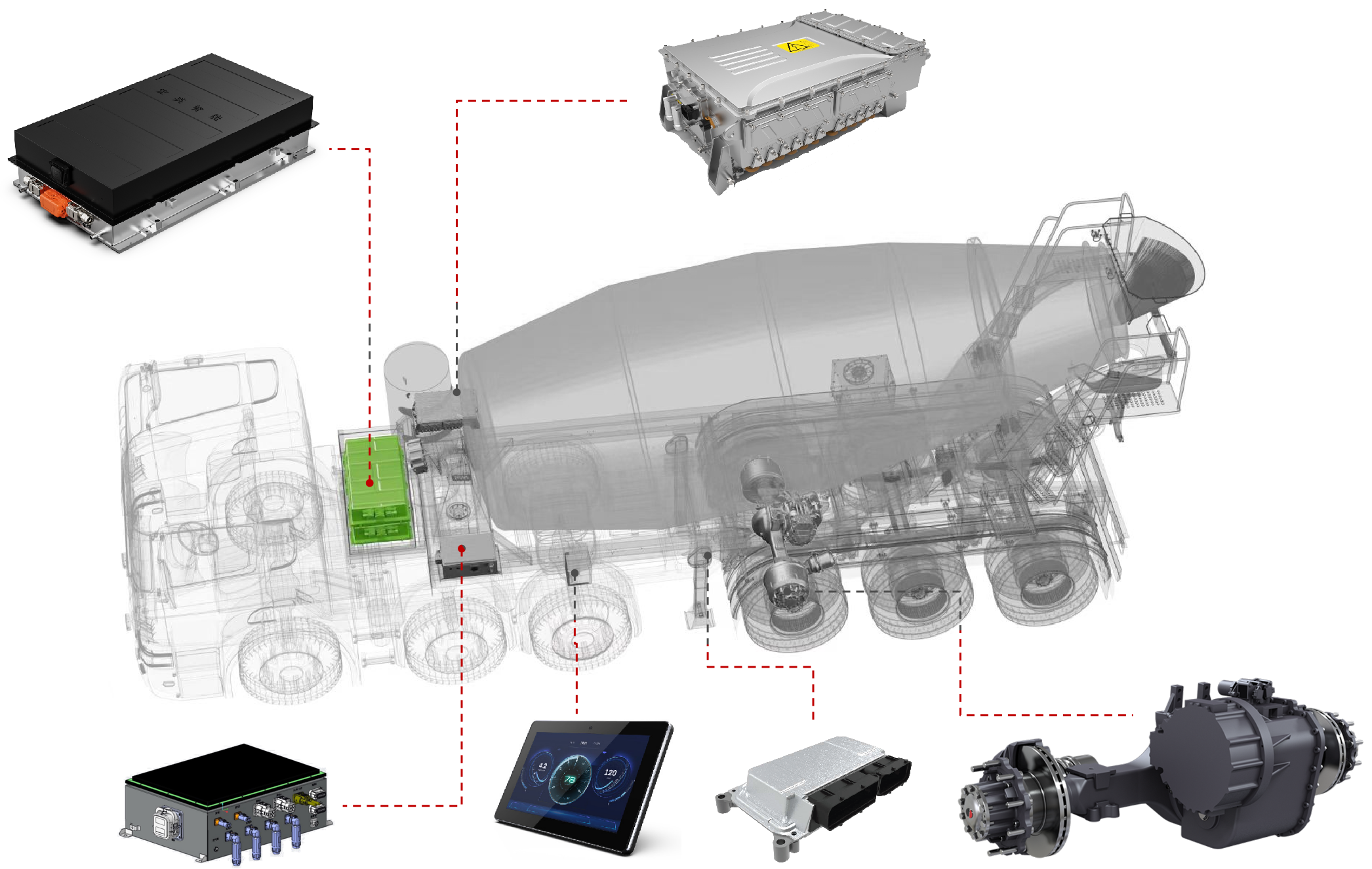 展会上,pa视讯游戏智能的智电一体化解决方案引起了广泛关注。工程师团队在现场为参展观众详细介绍了混合动力牵引搅拌半挂车的系统方案。该方案基于pa视讯游戏智能历经多年开发的eMagi智电平台,针对牵引搅拌半挂车进行了定向开发,涵盖以下几个方面: